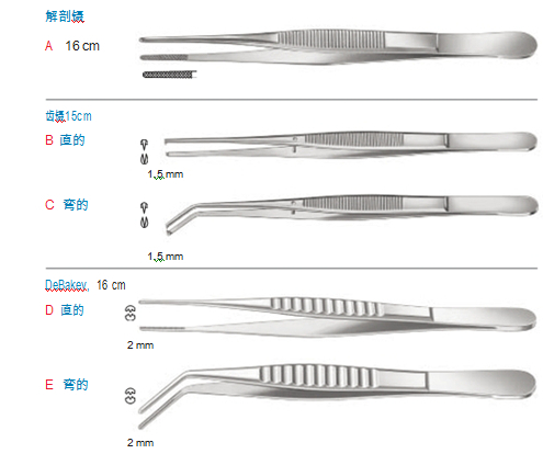 鑷子,高碳鋼材質,適用于手術及物體的夾持,金屬手柄為工作端鎢碳合金鑲片,更硬,更耐磨。