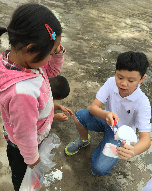 志愿者為當地小朋友演示如何進行正確的刷牙方法