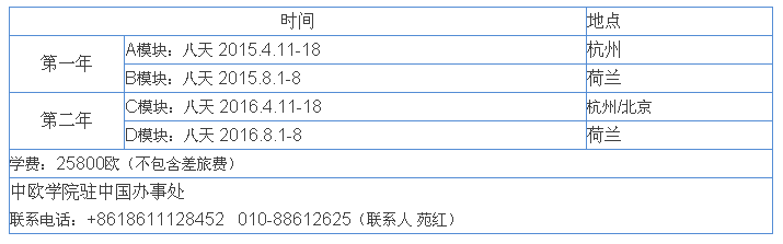 7 .培訓(xùn)課程地點(diǎn):第一學(xué)期在中國(guó),第二學(xué)期在歐洲荷蘭,第三學(xué)期在中國(guó),第四學(xué)期在歐洲荷蘭。